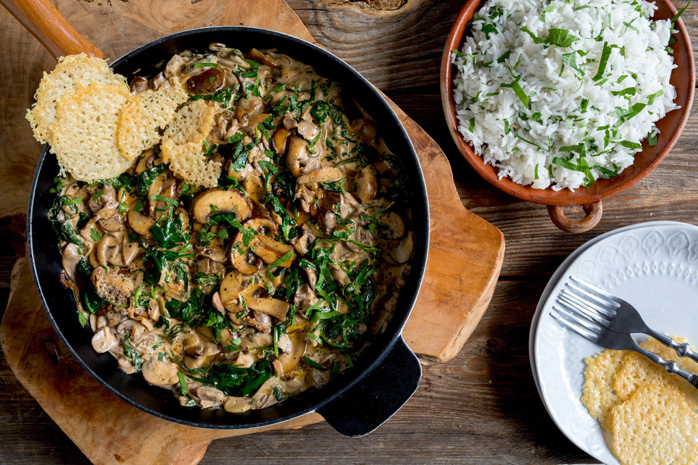 “De gast moet op de saus wachten, de saus niet op de gast!”, aldus Franse cuisinier Alexandre Dumaine. En wat voor een saus! Je maakt vandaag een veggie variant op de beroemde stroganoff met champignons en spinazie. We blijven trouw aan de oorspronkelijke smaken, maar voegen een crunchy topping aan onze stroganoff toe: in de oven gebakken kaaschips van Italiaanse kaas. Lees hier ons recept voor romige stroganoff met spinazie en kaaschips met basmatirijst.