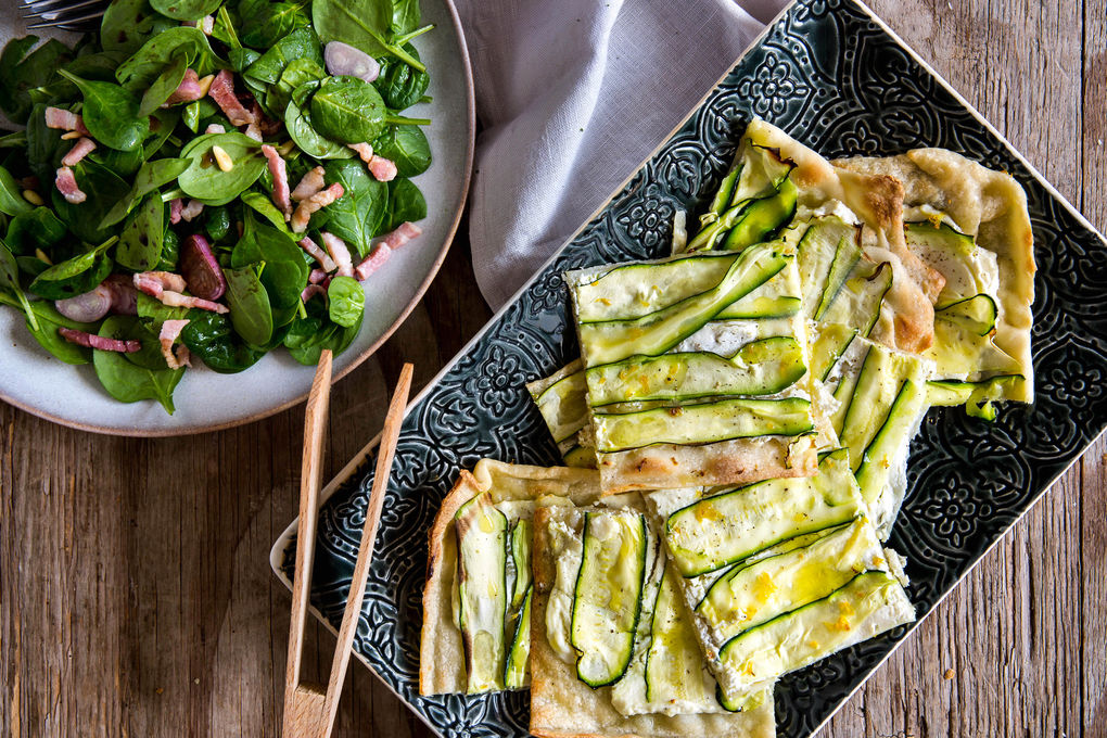 Flammkuchen met spekjes courgettelinten en spinaziesalade